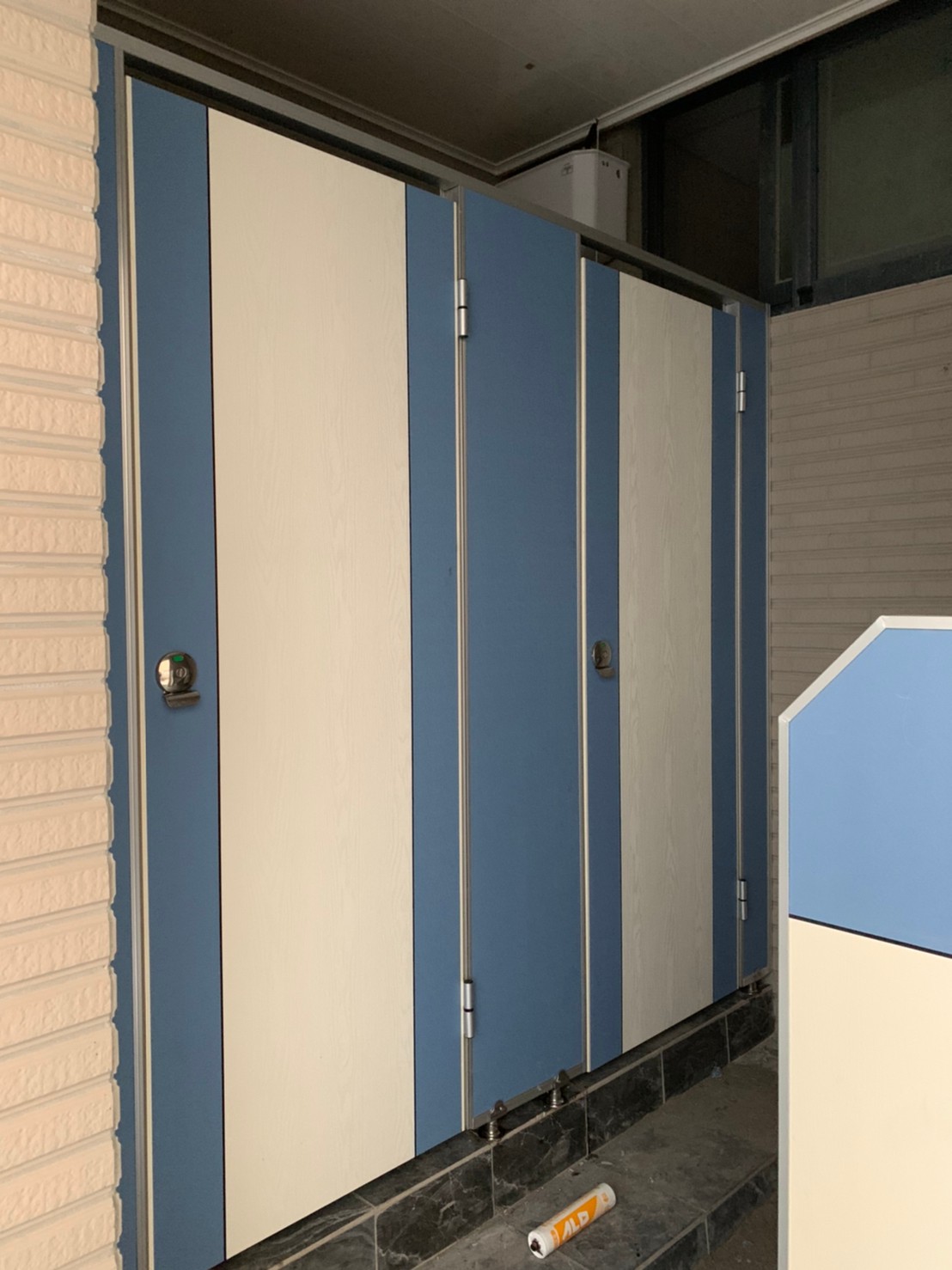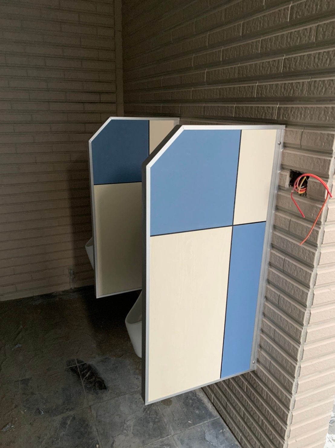 國道四號新建工廠搗擺工程施作, 利用ABS藍的板子去施作, 尿隔板則是用類似BMW的廠徽(藍白相間)去做設計, 以特別的方式在工廠內做點點綴!